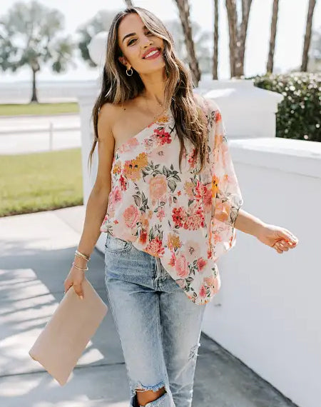 T-Shirt Mit Blumenmuster, Hohem Ausschnitt Und Asymmetrisch Merkmalen