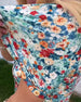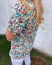 Lässige bluse mit kapuze und blumenmuster und kurzen ärmeln