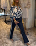 modische bluse mit leopardenmuster und V-ausschnitt sowie patchwork-spitze