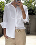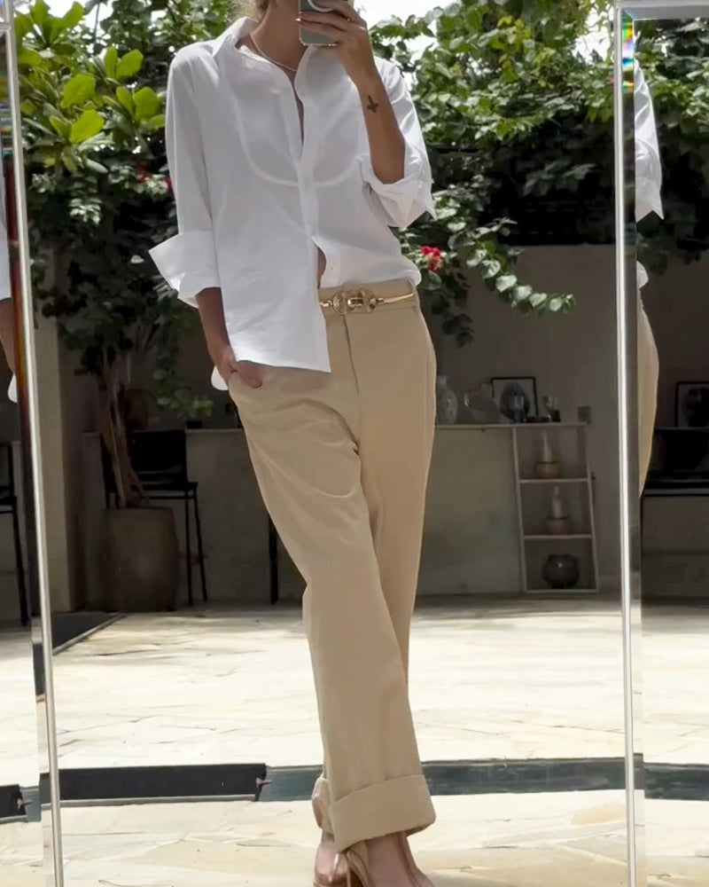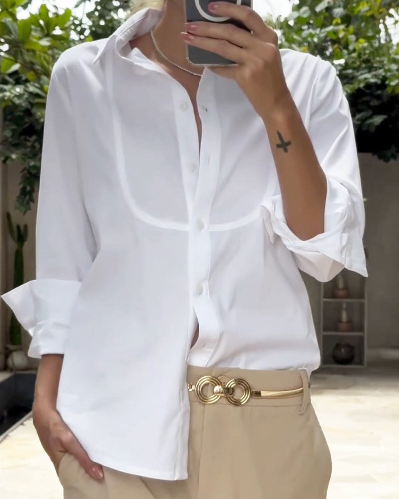 Lässiges, einfarbiges langarmhemd mit v-ausschnitt und knopfleiste