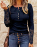 Elegantes, einfarbiges oberteil mit spitzen-patchwork und knöpfen
