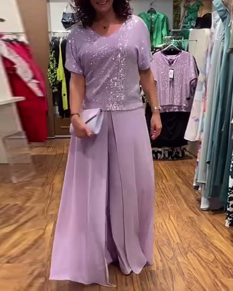 Lässiges, einfarbiges oberteil mit pailletten und v-ausschnitt