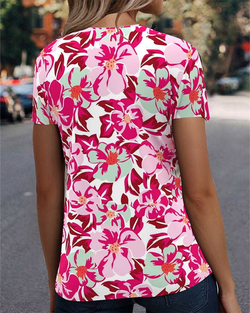 Lässige bluse mit kapuze und blumenmuster und kurzen ärmeln