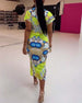 Bunt bedrucktes taschenkleid mit v-ausschnitt und halbarm