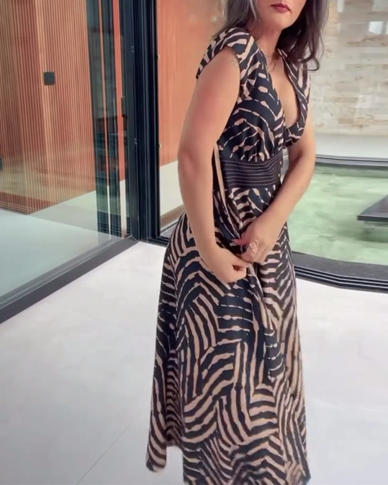 Elegantes bedrucktes Kleid mit V-Ausschnitt und Krawatte