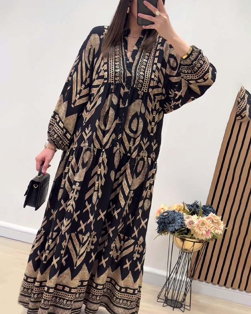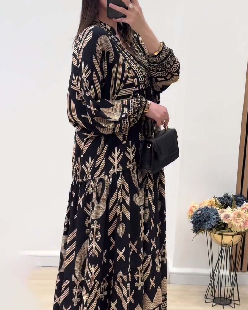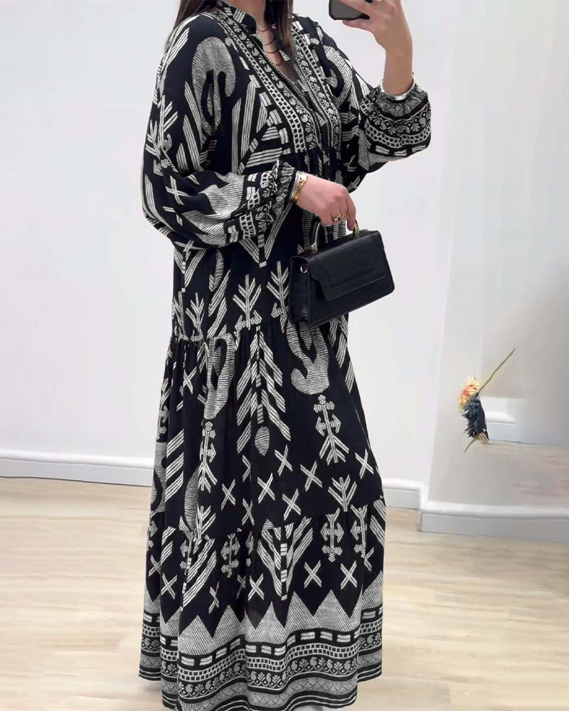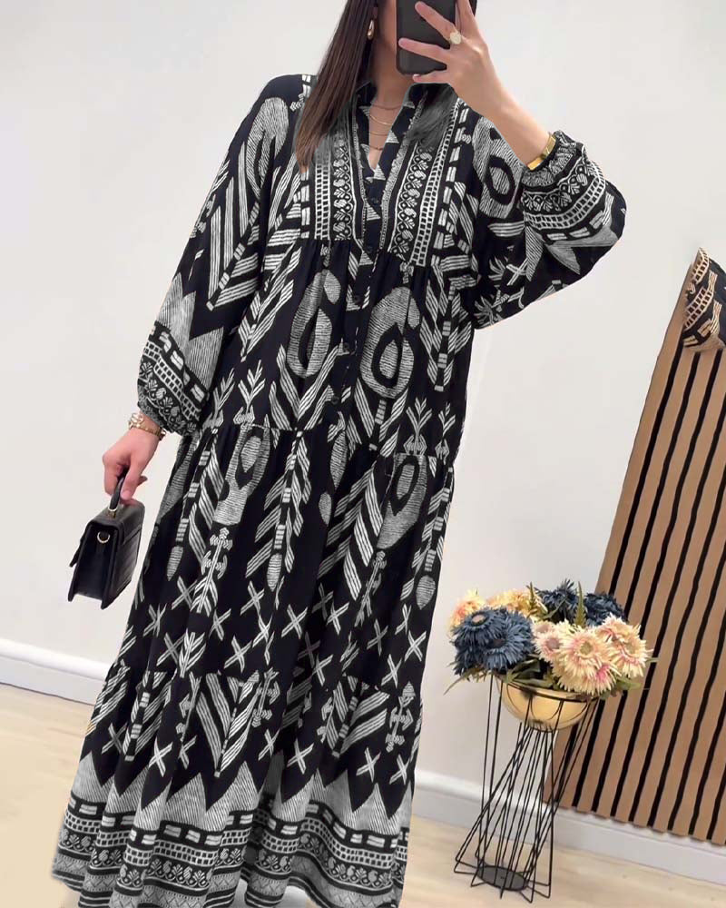 Bedrucktes kleid mit v-ausschnitt und langen ärmeln