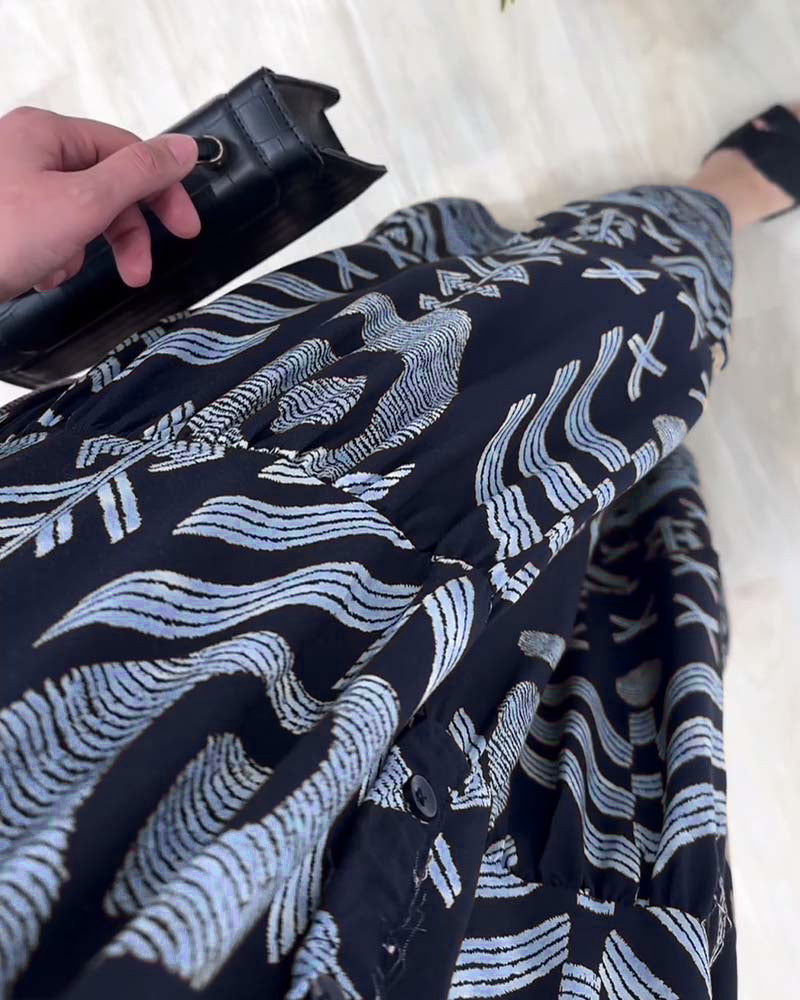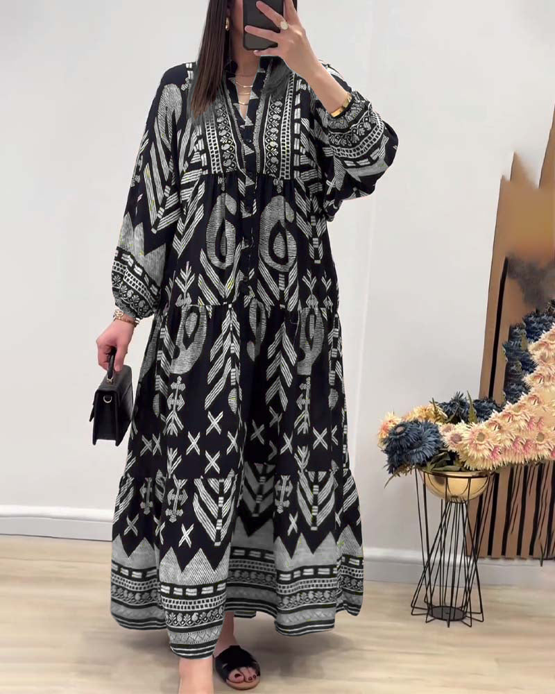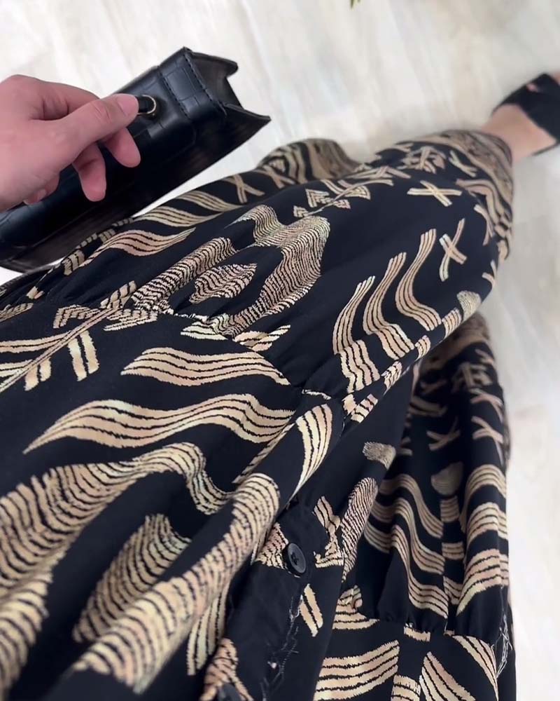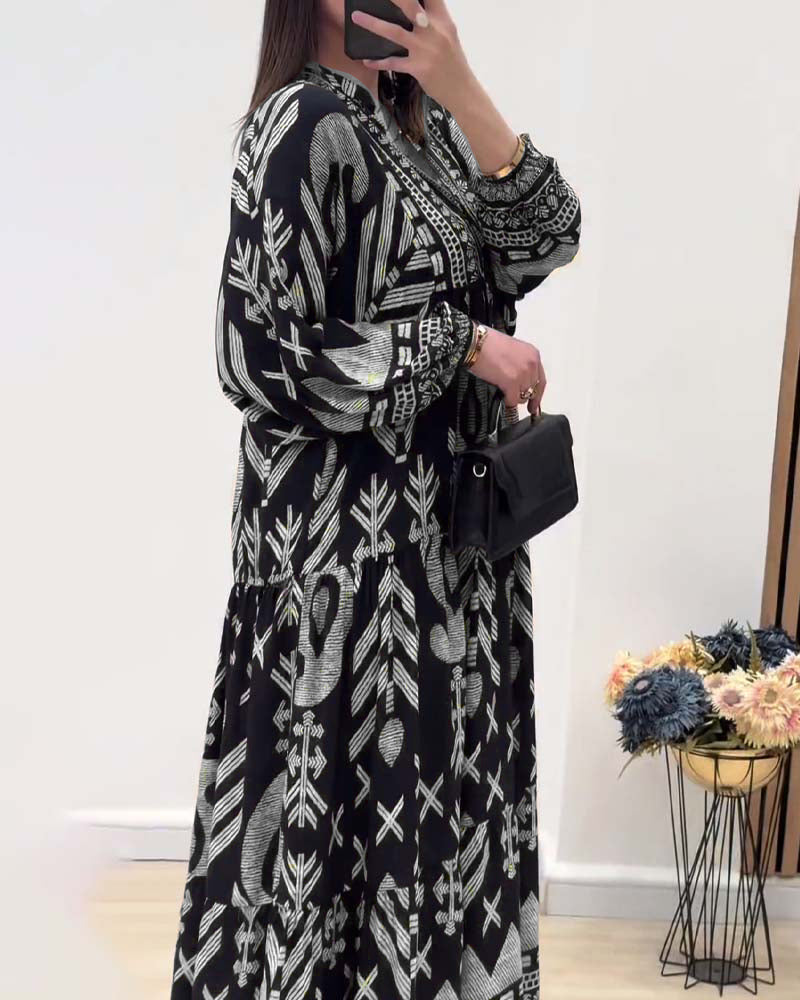 Bedrucktes kleid mit v-ausschnitt und langen ärmeln