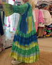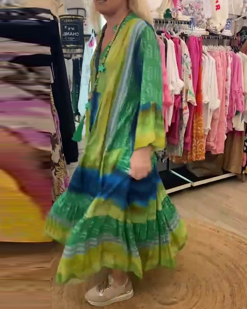 Bedrucktes, lässiges, langes kleid mit ausgestellten ärmeln und v-ausschnitt