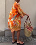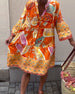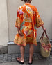 Bunt bedrucktes taschenkleid mit v-ausschnitt und halbarm