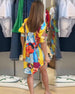 Bunt bedrucktes taschenkleid mit v-ausschnitt und halbarm