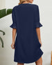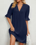Einfarbiges, elegantes kleid mit rüschenärmeln und v-ausschnitt