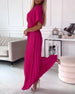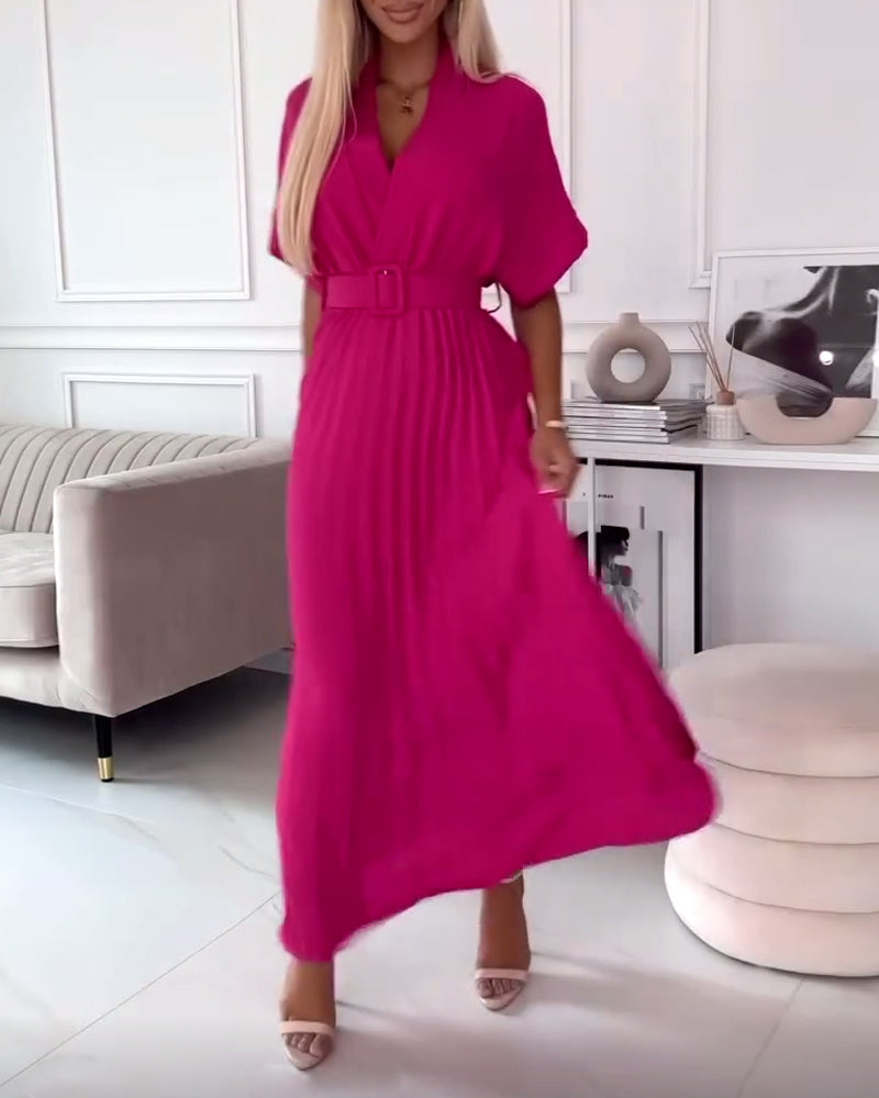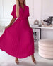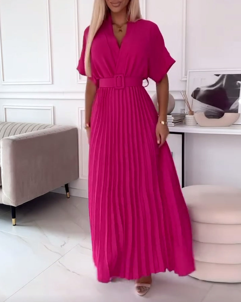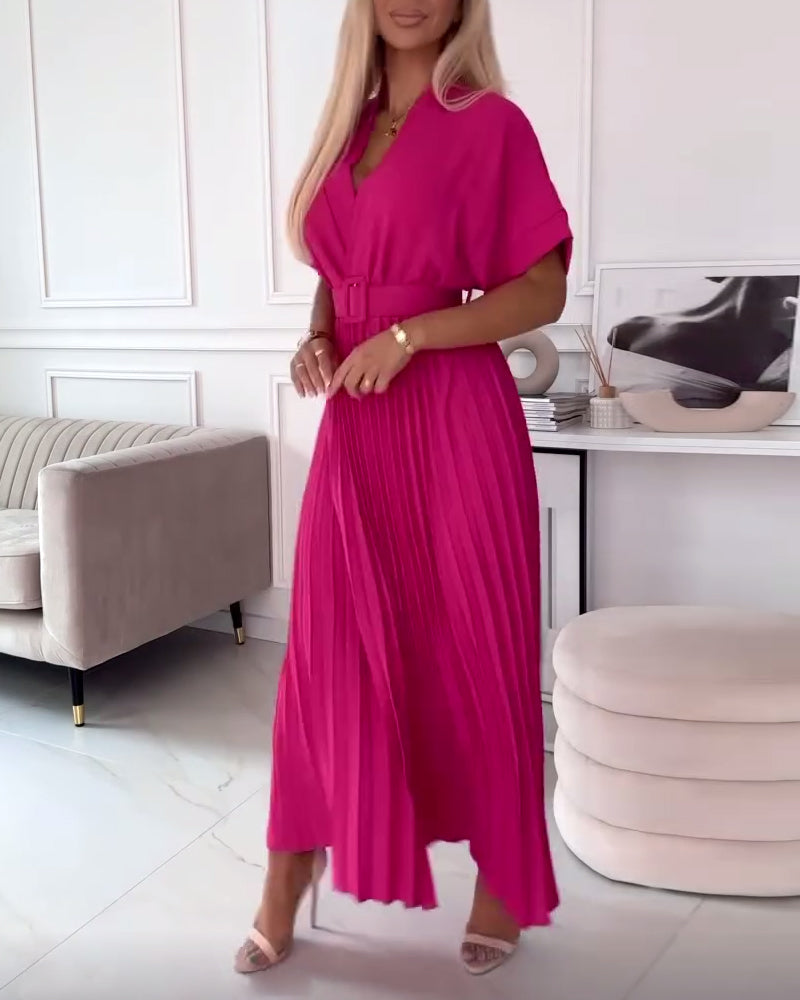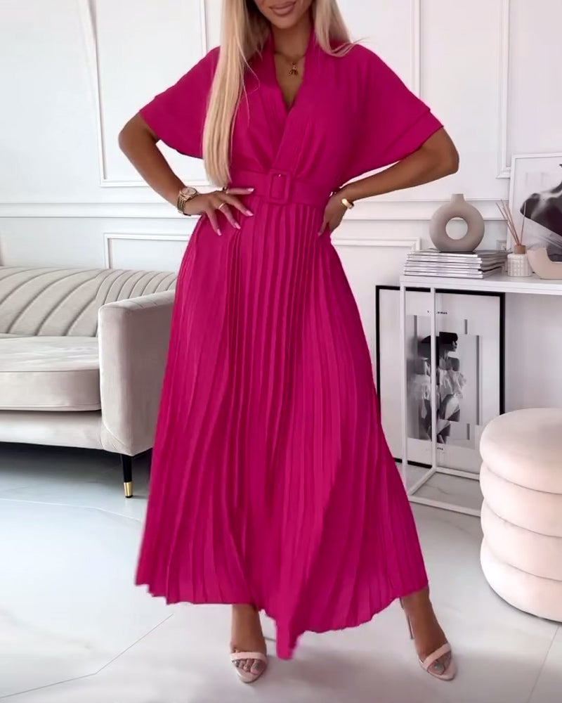 Einfarbiges, plissiertes, elegantes kleid mit v-ausschnitt und kurzen ärmeln