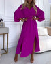 Elegantes, einfarbiges kleid mit v-ausschnitt, schlitz und langen ärmeln