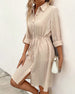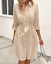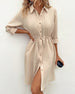 Lässiges kleid mit stehkragen und langen ärmeln und kordelzug