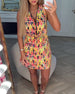 Bunt bedrucktes taschenkleid mit v-ausschnitt und halbarm