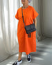 Einfarbiges kleid mit rundhalsausschnitt und langen ärmeln und tasche