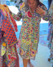 Bunt bedrucktes taschenkleid mit v-ausschnitt und halbarm