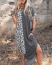 Stilvolles kleid mit patchwork-reißverschluss und tasche im leopardenmuster