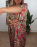 Bunt bedrucktes taschenkleid mit v-ausschnitt und halbarm