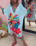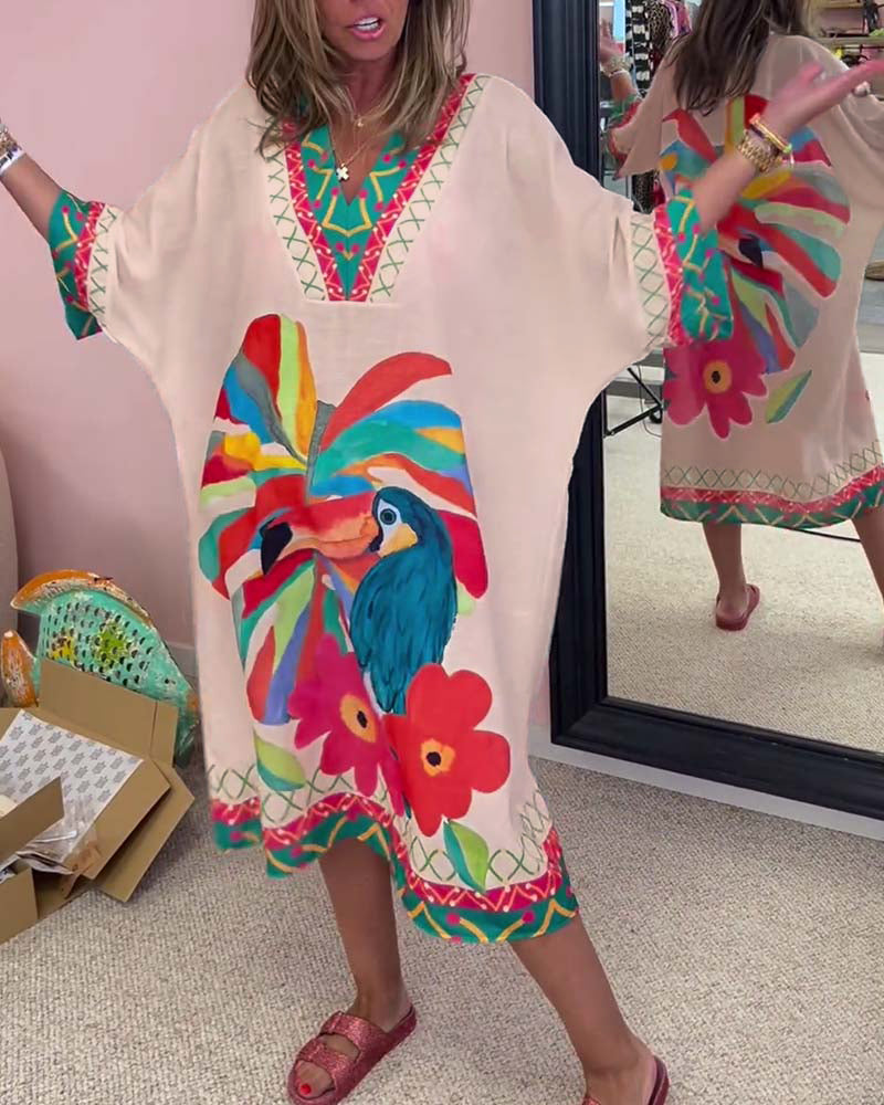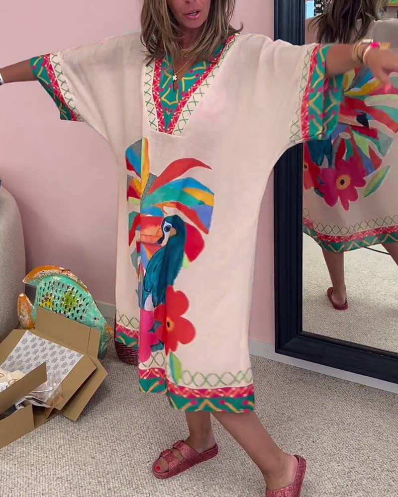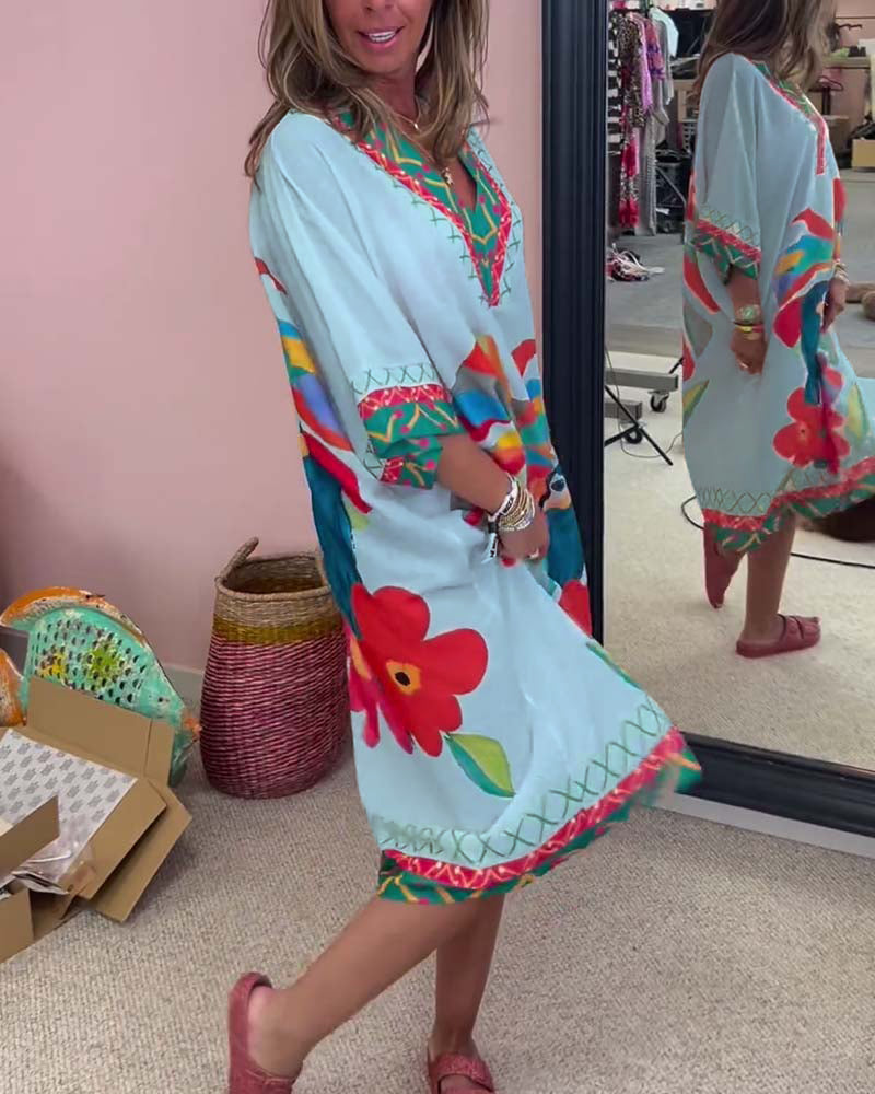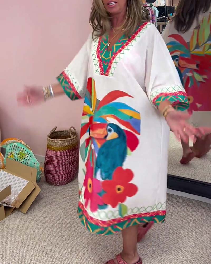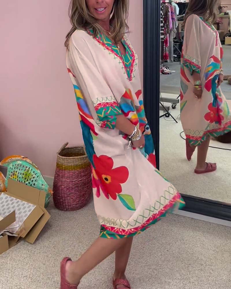 Lässiges Kleid mit V-Ausschnitt und Retro-Print