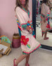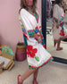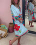 Bunt bedrucktes taschenkleid mit v-ausschnitt und halbarm