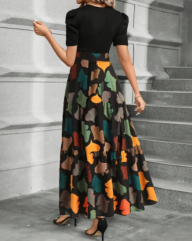 Kurzärmliges Schlitzkleid mit Blattmuster