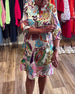 Bunt bedrucktes taschenkleid mit v-ausschnitt und halbarm