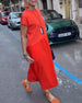 Einfarbiges, elegantes kleid mit rüschenärmeln und v-ausschnitt