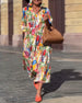 Bunt bedrucktes taschenkleid mit v-ausschnitt und halbarm