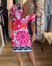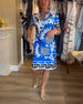 Bunt bedrucktes taschenkleid mit v-ausschnitt und halbarm