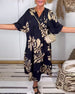 Kurzärmliges Schlitzkleid mit Blattmuster