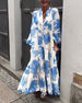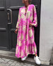 Lockeres bedrucktes patchworkkleid mit v-ausschnitt und glockenärmeln