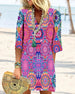 Bunt bedrucktes taschenkleid mit v-ausschnitt und halbarm