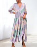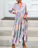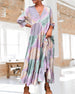 Bunt bedrucktes taschenkleid mit v-ausschnitt und halbarm