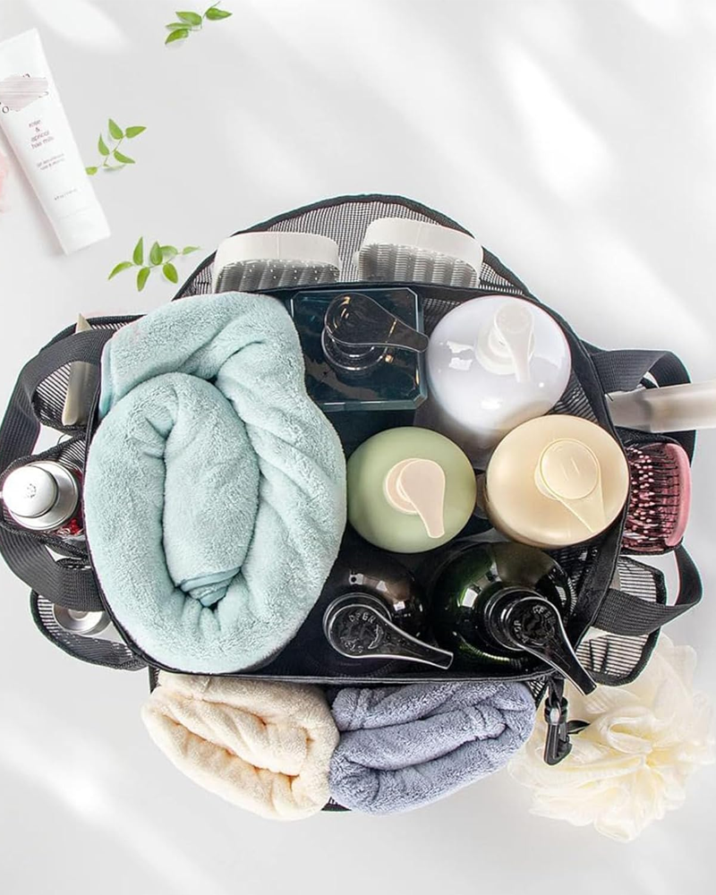 • Geräumiger Innenraum : Die Netzhandtasche mit großem Fassungsvermögen verfügt über ein großzügiges Hauptfach in der Mitte, perfekt für die Aufbewahrung Ihrer sperrigen Toilettenartikel, Kleidung, Handtücher und mehr. Es bietet ausreichend Platz, um Ihre wichtigsten Dinge organisiert und leicht zugänglich aufzubewahren.