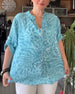 Bedruckte bluse mit v-ausschnitt, taschenknopf und dreiviertelärmeln