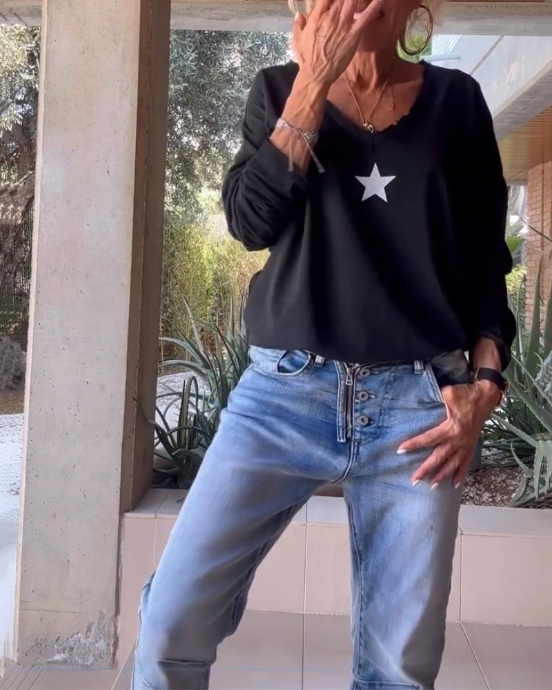 Bedrucktes Top mit V-Ausschnitt und Stern