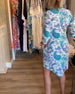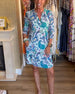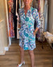 Bunt bedrucktes taschenkleid mit v-ausschnitt und halbarm