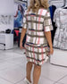 Bunt bedrucktes taschenkleid mit v-ausschnitt und halbarm