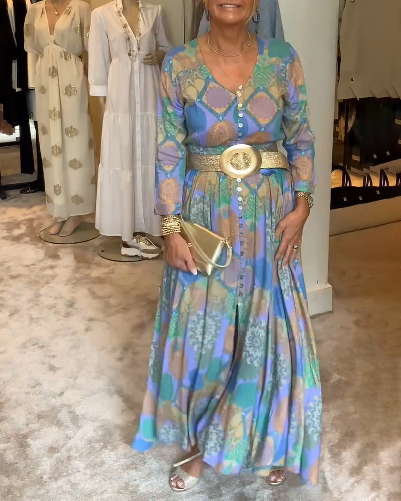 Vintage-kleid mit bedrucktem knopfschlitz und langen ärmeln